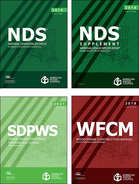 Save when you order the 2018 Wood Frame Construction Manual (WFCM) for One- and Two-Family Dwellings, 2018 National Design Specification Package and 2021 Special Design Provisions for Wind and Seismic together.